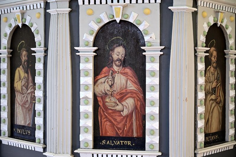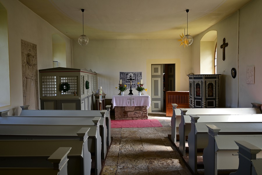 Die Abtrennung links vom Altar ist eine Prieche. Das ist die Abgrenzung zwischen der Patronatsfamilie und der allgemeinen Gemeinde. In ihr stehen noch zwei alte Patronatsstühle, die Stühle auf dem der Patron und seine Frau dem Gottesdienst beigewohnt haben.